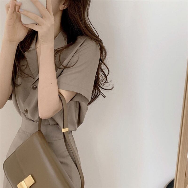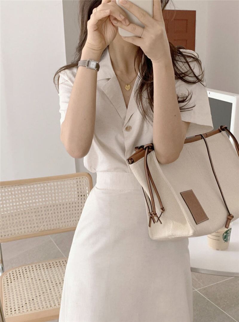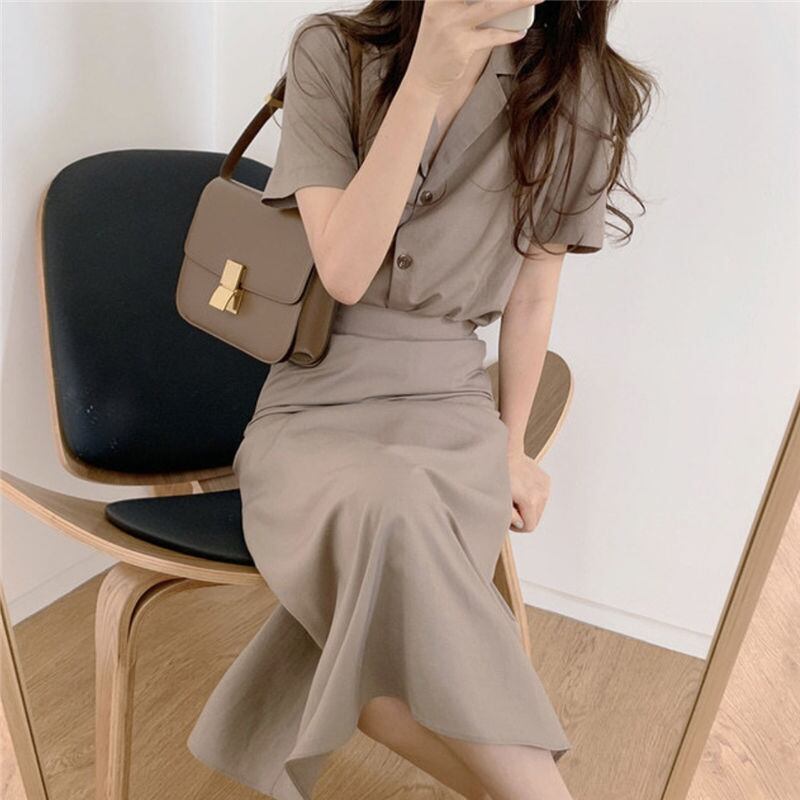 「set」春夏新作折り襟無地ブラウス+Aライン体型カバースカートおしゃれセットアップGF4366