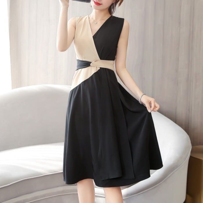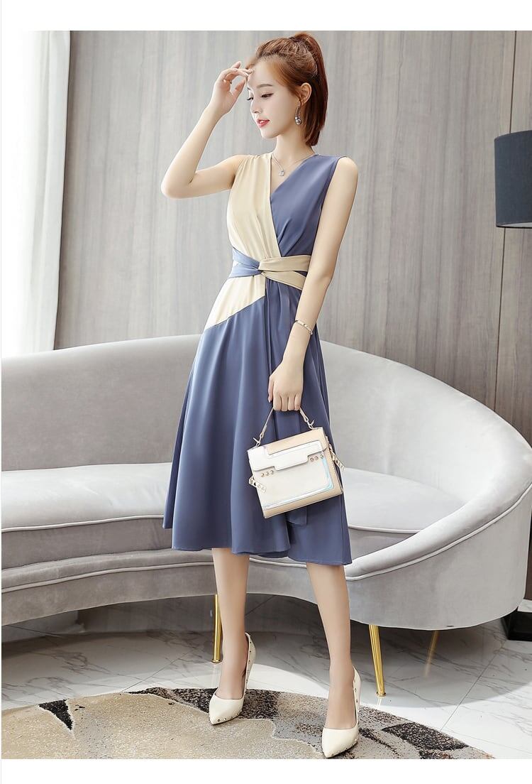 「dress」新作気質満点VネックノースリーブカラーマッチングワンピースGF4391