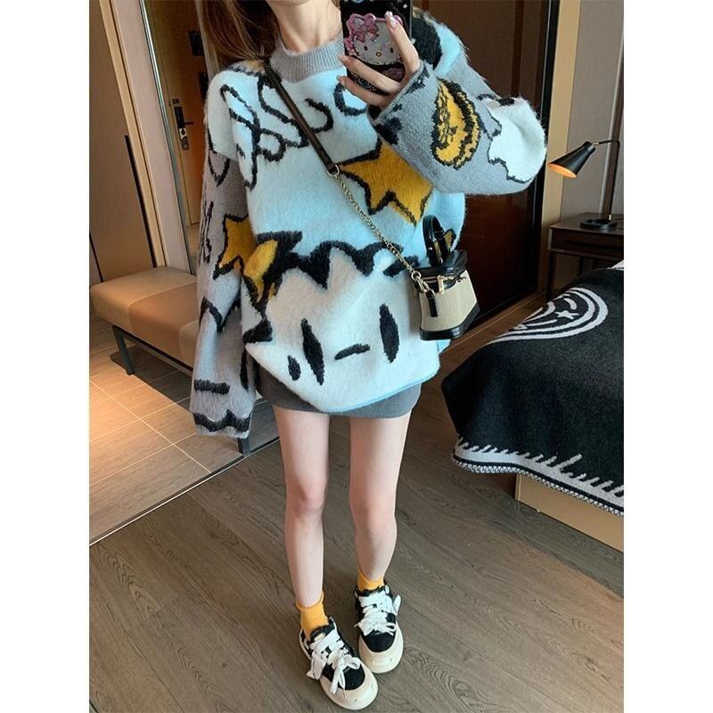 主役級 落書きストレート系ゆったりニットセーター厚手トップスGF4020