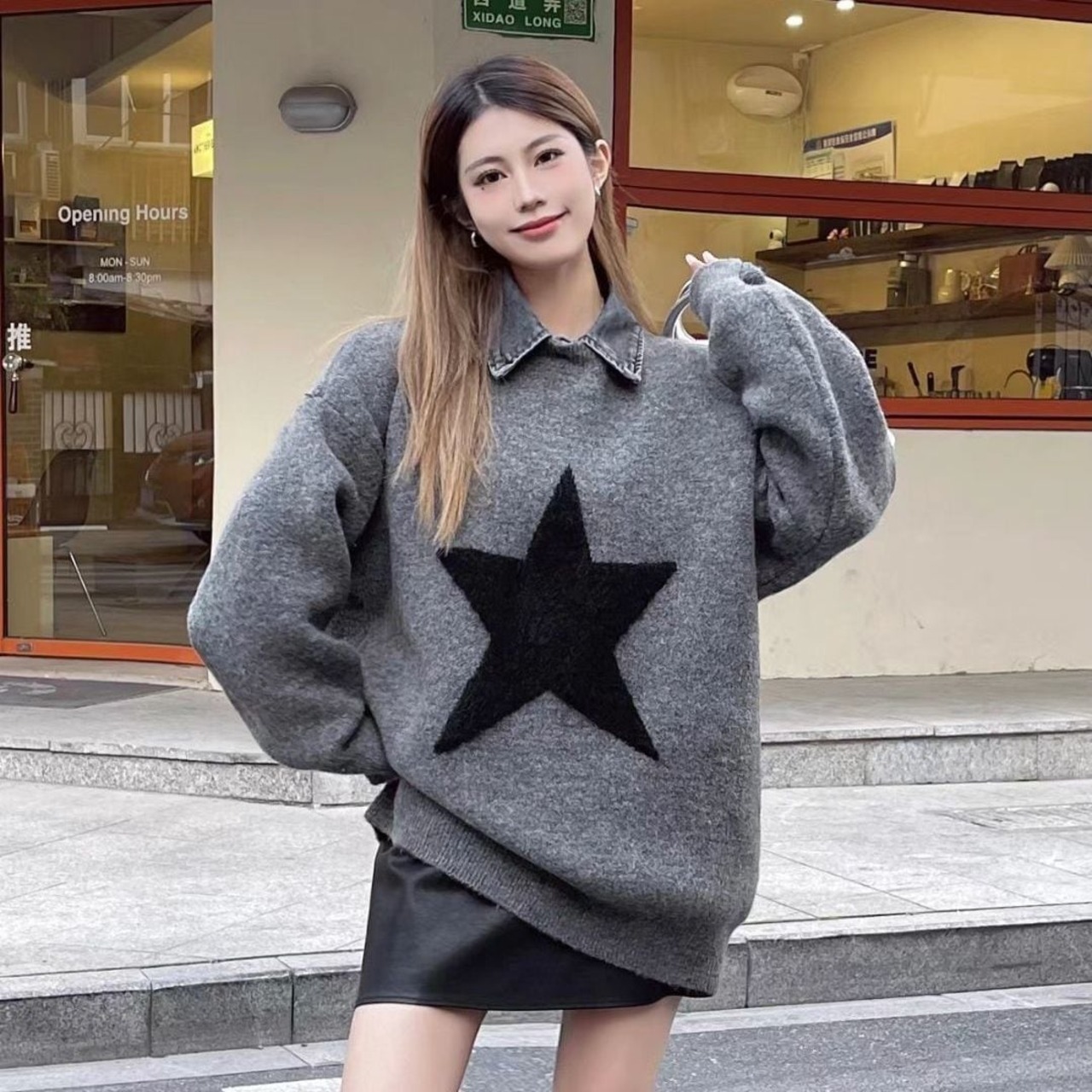 レイヤード風 星柄ロゴ厚手ゆったりニットトップス全3色GF4026