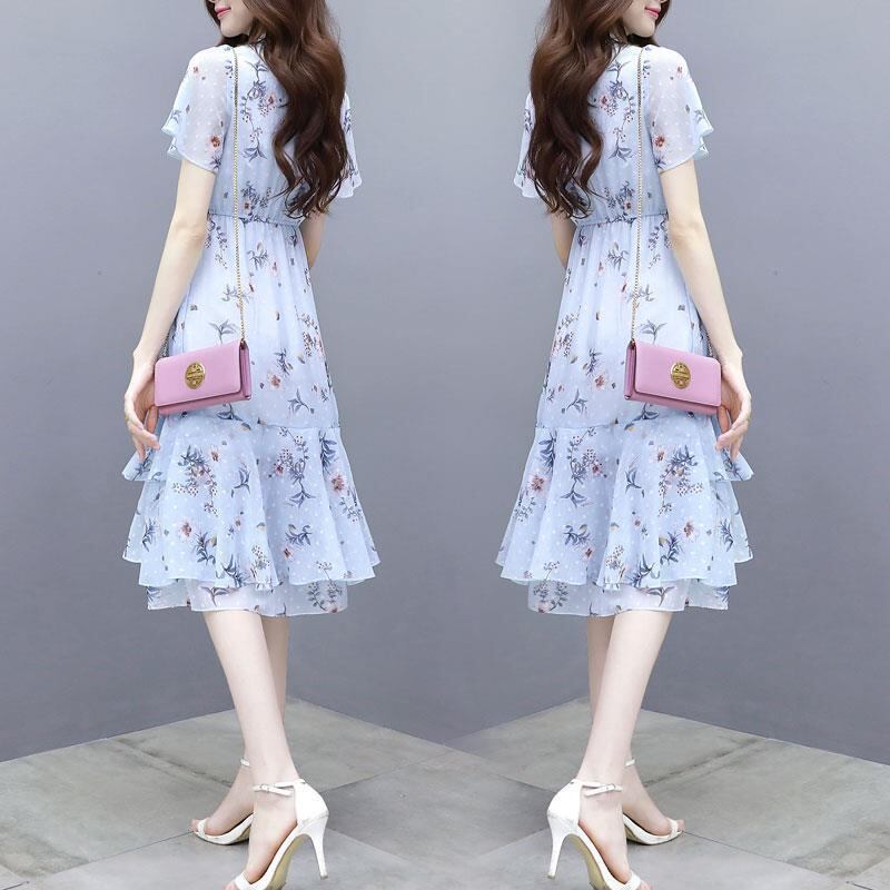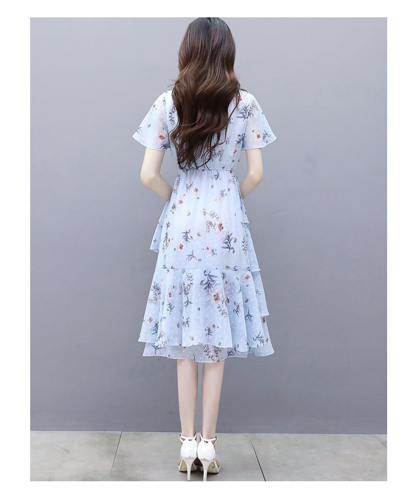 「dress」清新スウィート~タイカラーフレアスリーブ韓国風ギャザー花柄ワンピースGF4091
