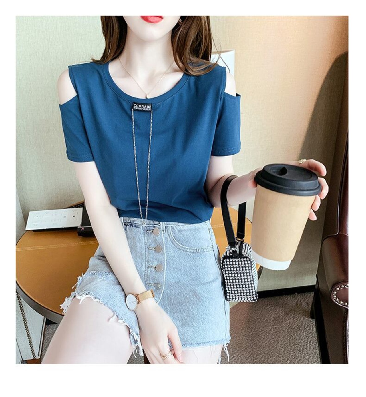 「tops」春夏新作ラウンドネック半袖オフショルダー無地着回し韓国風TシャツGF4116